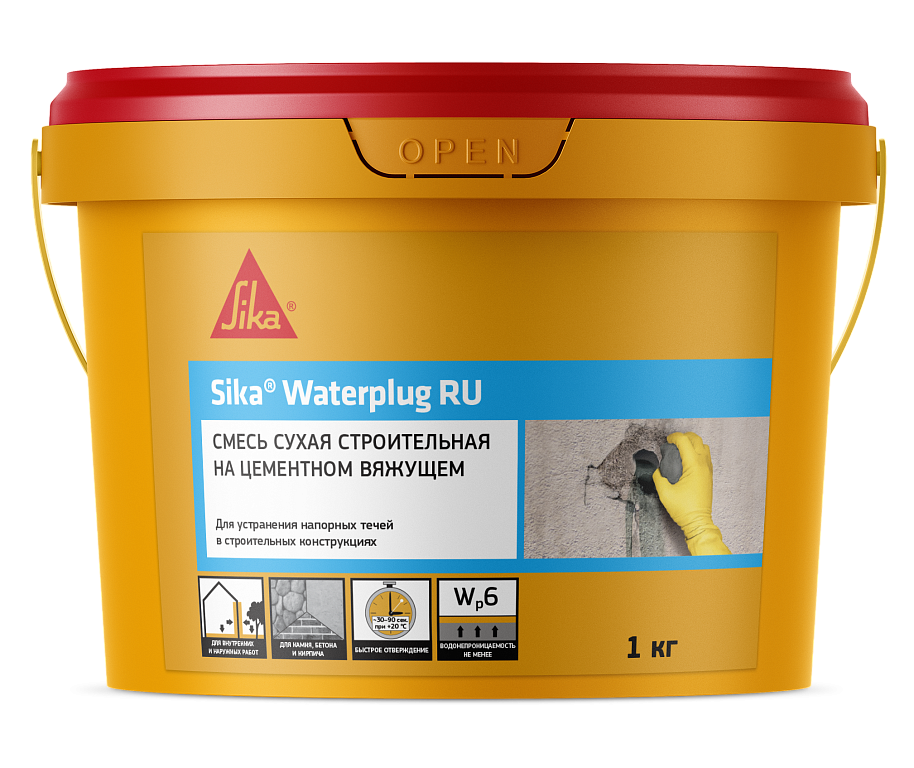 Sika® Waterplug RU - однокомпонентный сверхбыстротвердеющий гидроизоляционный состав на основе специальных цементов и мелкого заполнителя, предназначенyый для быстрой ликвидации активных протечек.